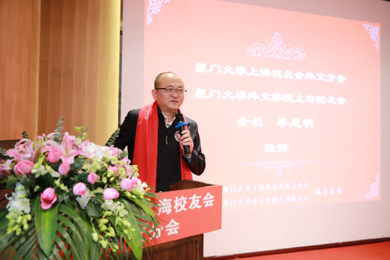 首任会长李思明代表厦门大学上海校友会外文分会暨厦门大学外文学院上海院友会在大会上致辞。他首先对广大院友的信任和支持表示感谢,讲述了上海院友会筹备组响应广大外文院友的诚挚请求,希望通过搭建平台推动院友间的相互沟通、交流学习、共同发展的初衷,希望院友们能在上海院友会这个精神家园中互助互爱。李会长特别指出,外文分会作为厦门大学上海校友会的一员,将积极协助上海校友会发展壮大,并将计划举办一系列院友会活动。
