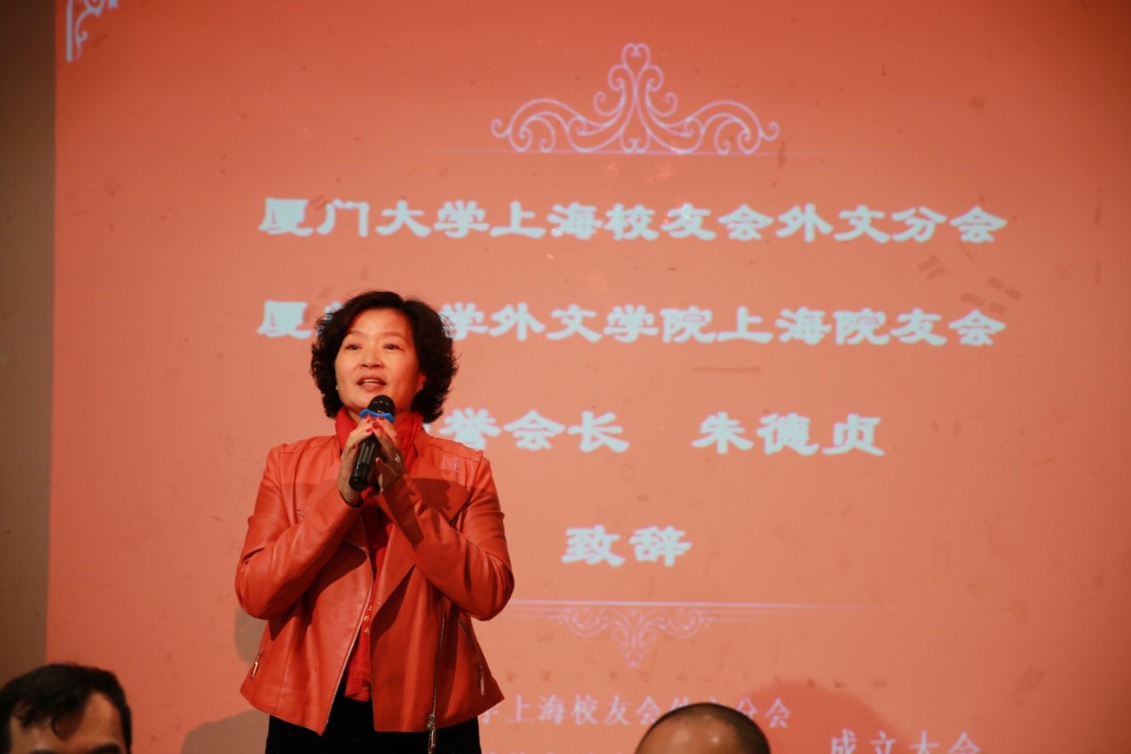 荣誉会长朱德贞致辞。她在致辞中表达了对母校、学院的感恩之情,并表示十分有信心建设好外文院友们在上海的精神家园。