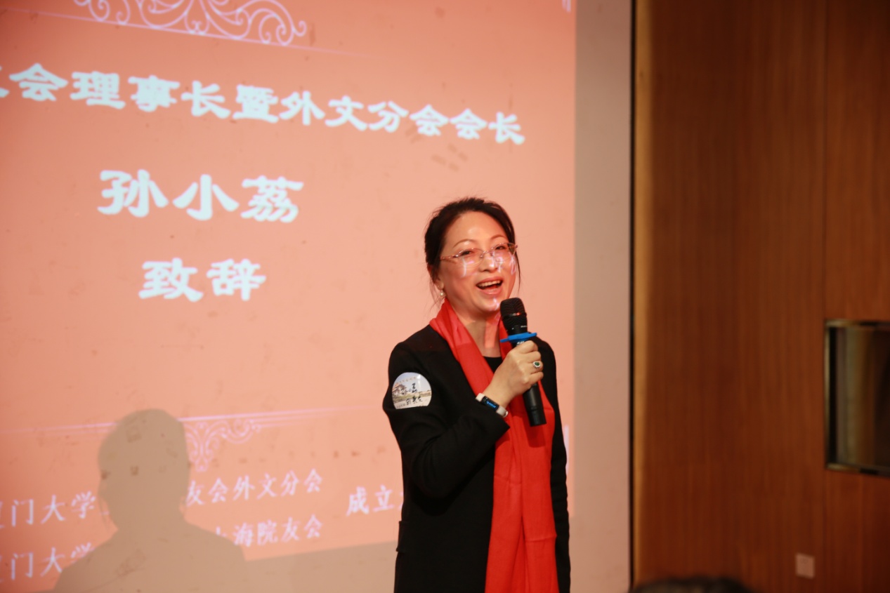 厦门大学深圳校友会理事长暨外文分会会长孙小荔在致辞中代表深圳校友们对上海院友会的成立发表祝福。