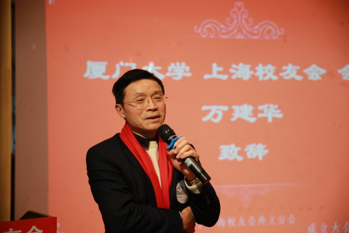 厦门大学上海校友会理事长万建华在大会上致辞。他为厦门大学上海校友会外文分会作为2018年新年成立的第一个分会送上深深祝福,也期待外文分会能够为上海校友会增添一份强有力的力量。