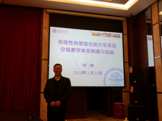 常辉教授首先解释分析了“有效性”、“智能化”和“分级”三个关键词,重申了大学英语分级教学的必要性。同时,他认为秉着一切从实际出发的理念,当今大学英语教学的主要任务是提高学生的英语水平,教学应以学生为主,影响学生学习最重要的因素是动机。大学英语主要通过自主学习进行,教学为学生提供可靠的路径达到学习目标。上海交通大学的教学实践是通过向学生提供实用性强的学习内容,组织多次精细、科学化的水平测试,做到跟踪、提高学生的英语水平。常教授还分享了上海交大在英语教学改革体系、水平测试设计、师资建设和教育技术应用方面的探索和经验。
