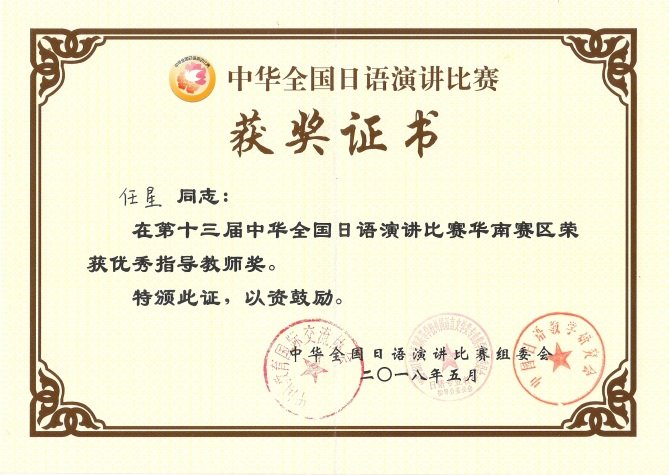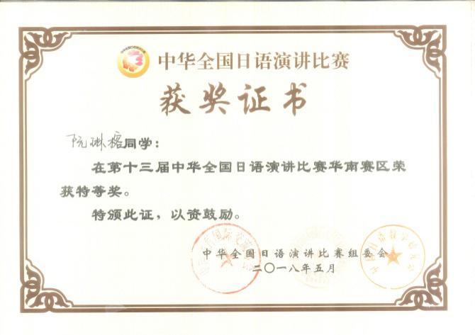 本次,阮琳榕同学在日语系任星老师、外籍教师皆见浩史、川本聪子为代表的指导团队的辛勤指导下,进行了刻苦的训练,最终荣获华南赛区特等奖。阮同学作为大二的学生,日语学习经历也只有一年半。而在高年级选手如云的比赛中再度卫冕彰显了我院日语系的实力,为日语系更增一份荣耀。希望阮同学在接下来的东京总决赛中能够再接再厉,取得更好的成绩。