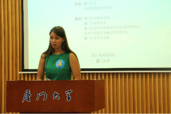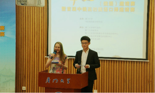 上午9时20分,邀请赛正式开始。本次大赛邀请到中国俄语教学研究会副会长、北京外国语大学俄语学院院长黄玫教授,中国俄语教学研究会副会长、黑龙江大学俄语学院院长白文昌教授,教育部高等学校外语专业教学指导委员会俄语专业分委员会副主任委员、南京大学俄罗斯学研究中心主任王加兴教授,台湾淡江大学俄文系系主任苏淑燕副教授,上海外国语大学俄语系杨仕章教授,厦门大学欧语系系主任杨杰教授,中国国际广播电台主持人Анна Аллаберт(安娜)担任评委。