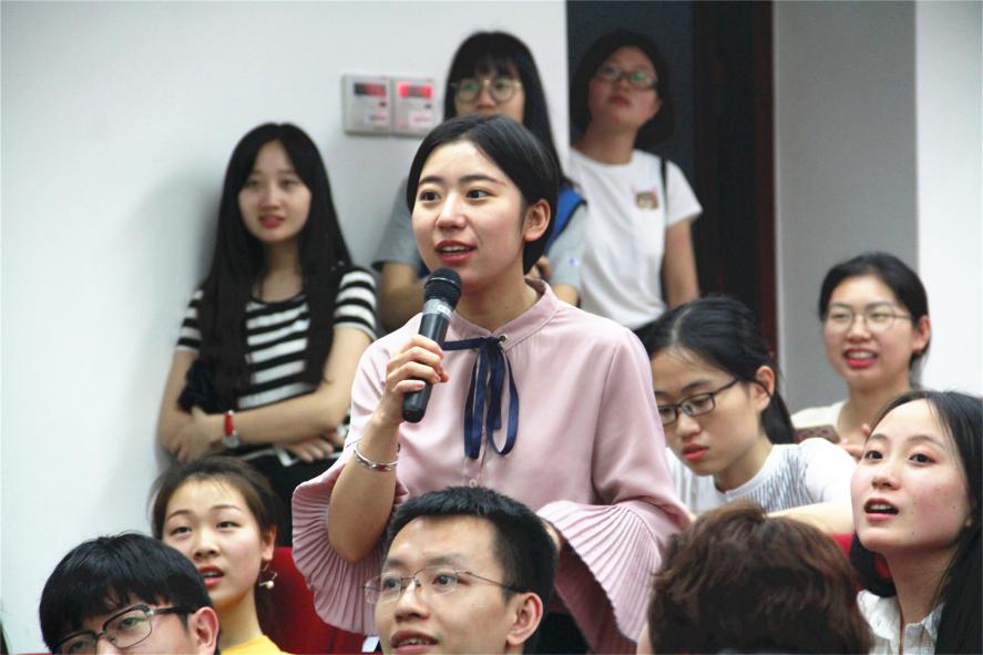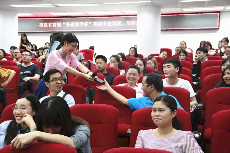 紧张的比赛过后进入轻松的观众互动环节。主持人组织现场观众们进行有奖竞答,题目大多涉及英美文学的专业知识,观众们热情度高涨,纷纷参与到互动竞答中去,现场氛围十分活跃。