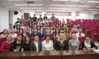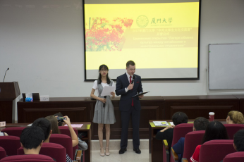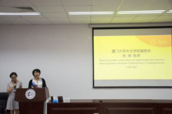 在一片热烈的掌声中,厦门大学外文学院副院长徐琪教授引用《论语》中的“有朋自远方来,不亦乐乎”,对所有前来参与交流营的老师和同学表示欢迎,并向大家详细介绍了厦门大学的创办历史,学校文化和国际交流情况以及外文学院的建院历史、专业设置和教学规模。接下来,徐琪副院长对本次“中俄大学生文化交流营”寄予美好的希望,并祝愿本次“中俄大学生文化交流营”顺利举办。