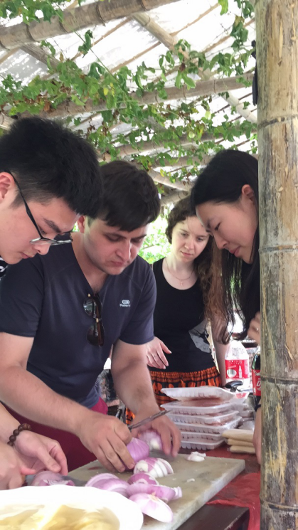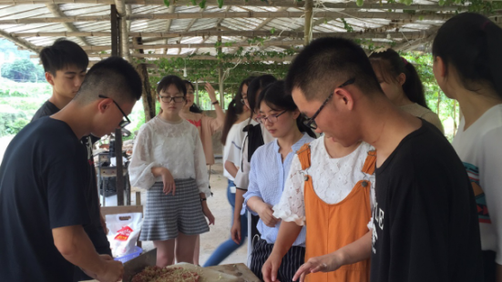 在厦门大学翔安校区的学生食堂用过午餐后,同学们乘车集体前往同安区的“房车公园”开始准备中俄特色美食。为了方便俄罗斯学生能顺利做出本国特色菜肴,中国学生事先采购齐全了俄罗斯学生所需要的牛肉、洋葱、甜菜头、酸奶油、炼乳等食材。这边的中国学生们开始洗菜、切肉、准备调料,那边的俄罗斯学生们也娴熟地开始烹饪本国美食,小伙子们用锋利的小刀处理着烤肉所需的牛肉,姑娘们驾轻就熟地煮起俄罗斯经典美食——红菜汤。