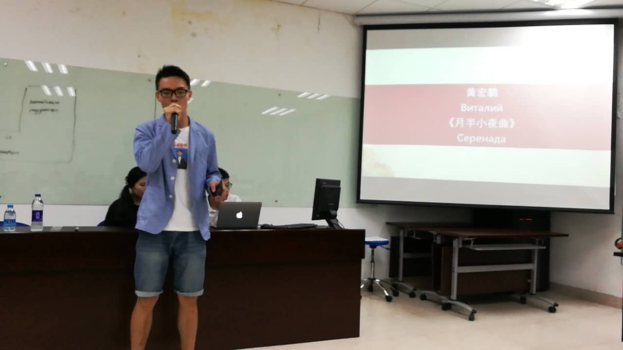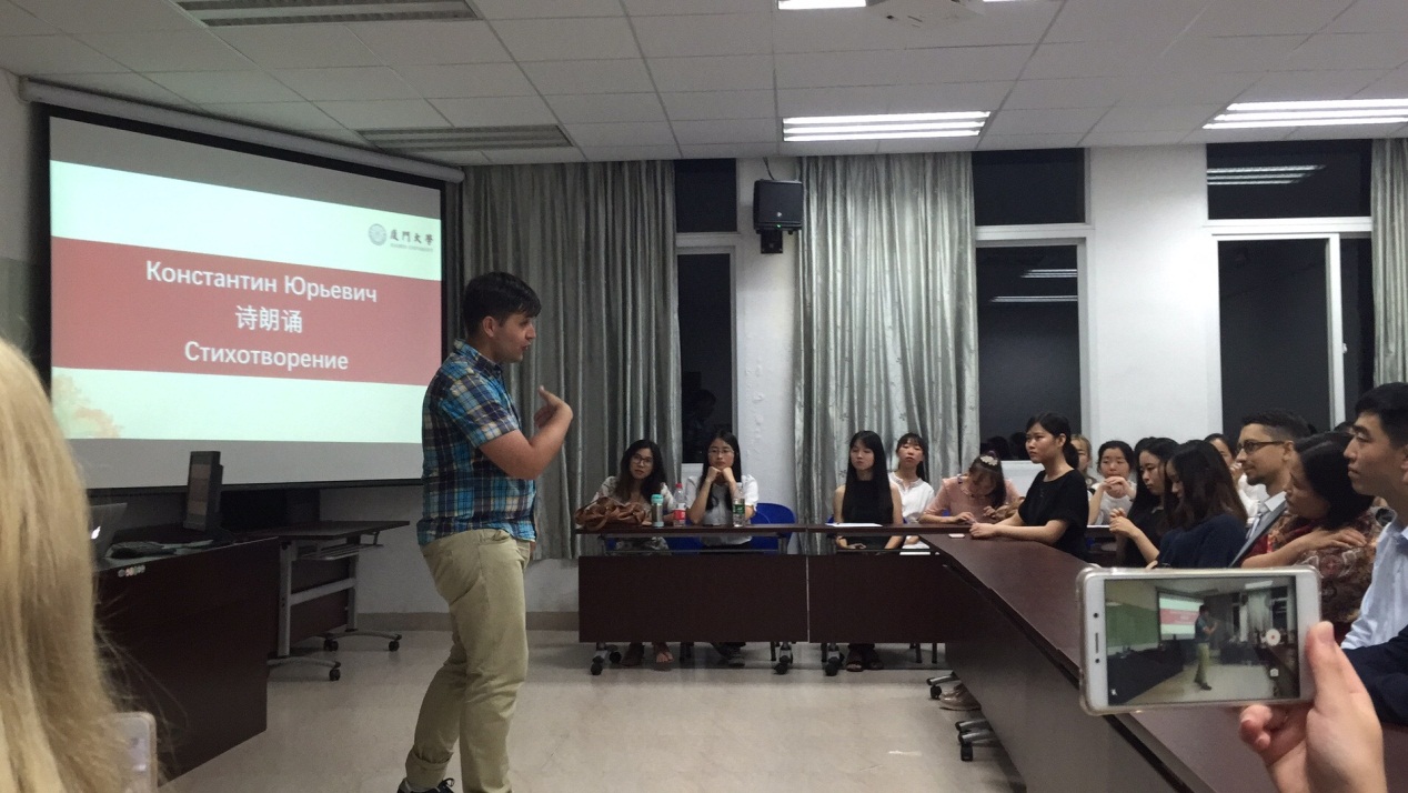 乌克兰学生МедведенкоСергей深情表演吉他弹唱,让现场观众深深陶醉。莫斯科大学学生АвдошкинКонстантин声情并茂地朗诵自己创作的诗歌——《七个奇迹》和俄罗斯诗歌《一切源自爱情》。