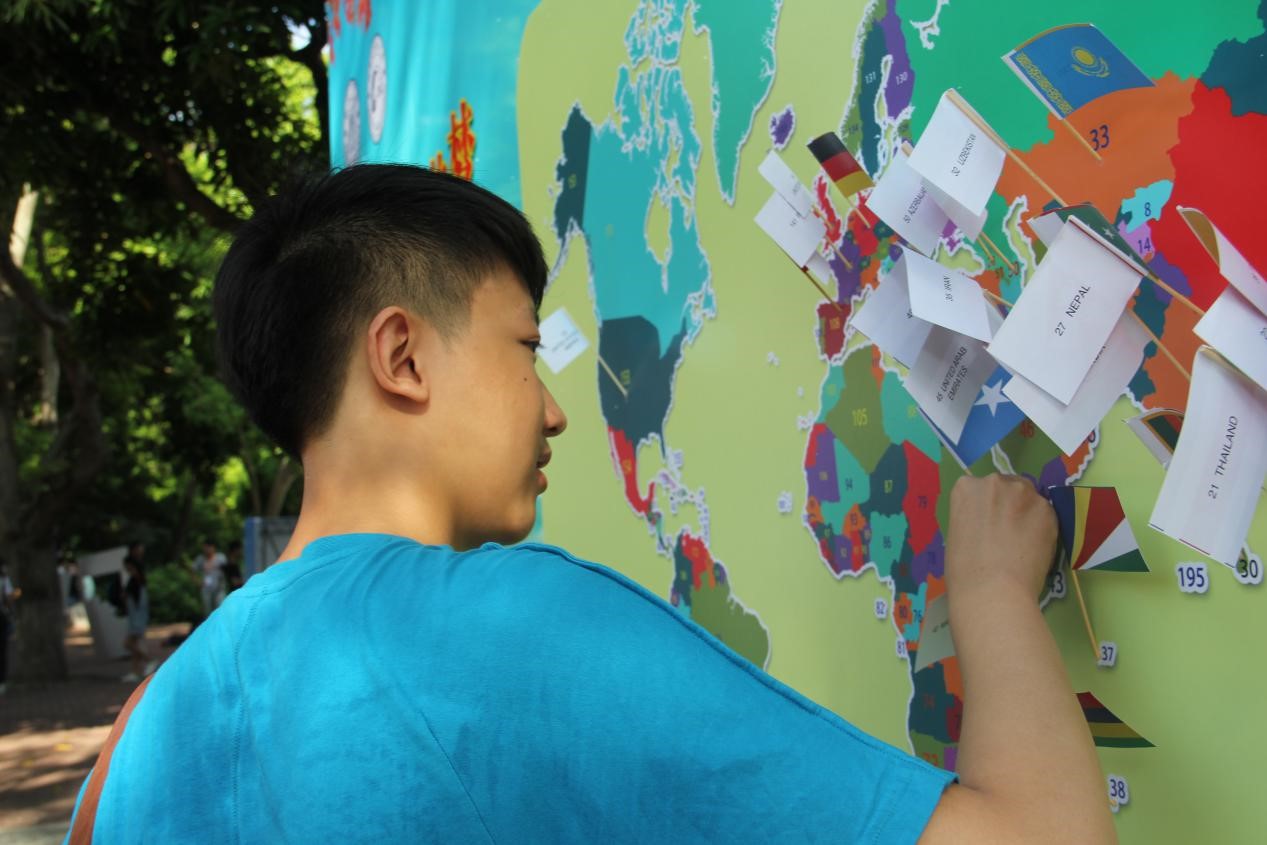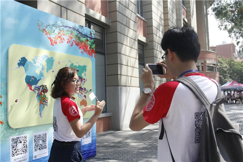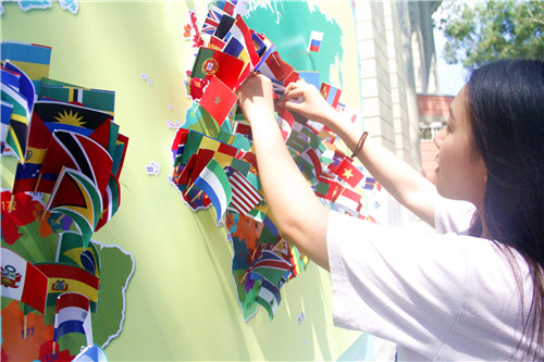 为了给2017级新生的入学第一天留下美好回忆,学院延续往年传统,为新生准备了独具特色的迎新活动。在印着完整世界地图的“中国梦,我的梦”背景板前,新生们自己挑选一个国家的国旗,并按照该国的所在位置将国旗插在世界地图上并与之合影留念。一个上午过后,五颜六色的各国国旗已经密密麻麻地插满了大半张地图,吸引了众多好奇和艳羡的目光。
