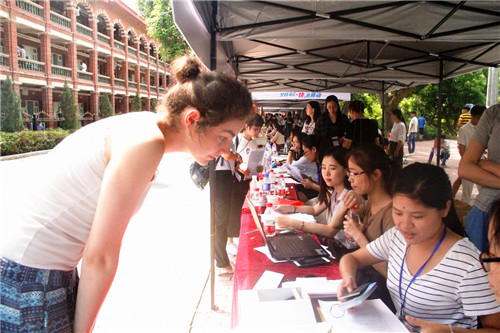 第一天上午10点左右,张荣校长、林东伟副书记来我院迎新点了解迎新进展,对前来报到的同学们表示慰问,询问了新生的基本情况,并与在场的外文师生亲切交流。在我院师生的盛情邀请下,张荣校长和林东伟副书记还亲自参与了“中国梦,我的梦”活动,在世界地图上插上了中国国旗。张荣校长表示,“世界眼光”和“家国情怀”对外文学院的学生意义深远重大,希望所有外文师生都能将此次参加厦门金砖会晤的服务奉献精神传承下去,在国际性舞台上发挥越来越重要的作用。