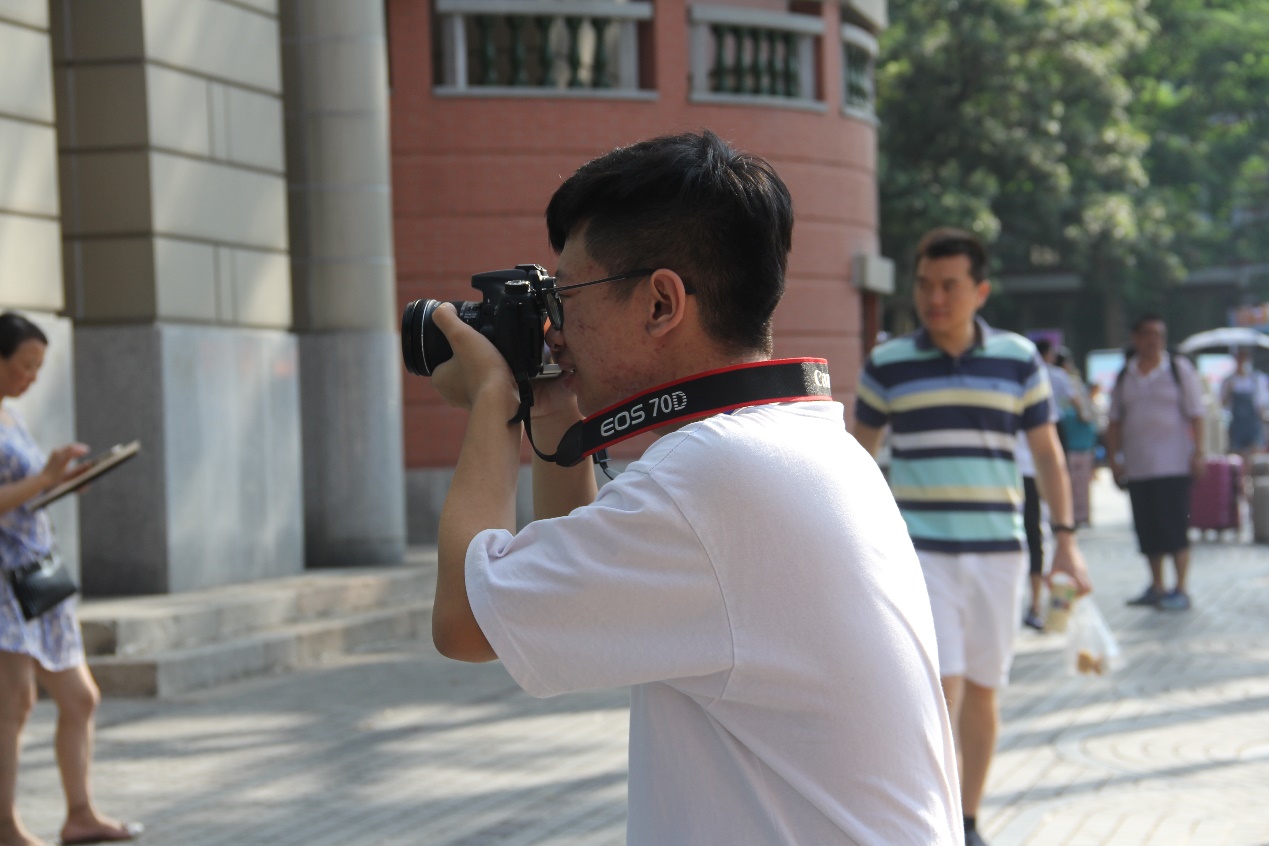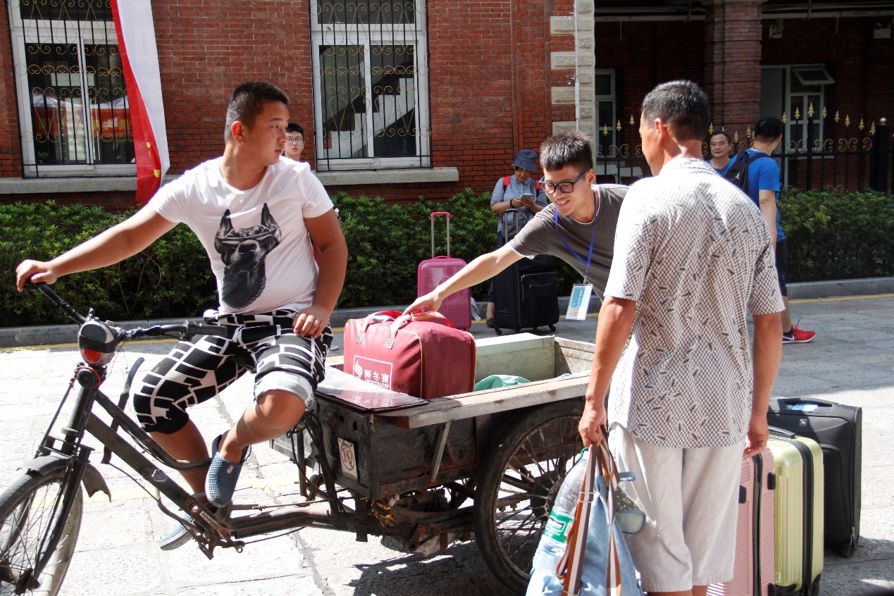 在炎炎烈日下辛勤忙碌的,除了注册组的志愿者们,引导组、行李组和宣传组的同学们也在烈日下辛勤地忙碌着。引导组的同学们高举外文学院院牌在校门口等候新生并将他们引导至迎新点;还有些引导组的志愿者来往于与注册点与宿舍之间,为新生们带路并介绍校园;行李组的同学们则守在行李运送点,为新生们送行李并仔细做好登记领取工作;宣传组的同学在世界地图前为每个新生拍照留念,将他们初进校园的灿烂笑容永久保存在相片之中,并引导新生们和家长们扫码关注外文学院官方微信平台“厦大外文CFLC”获取学院的最新资讯。