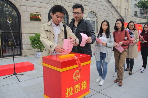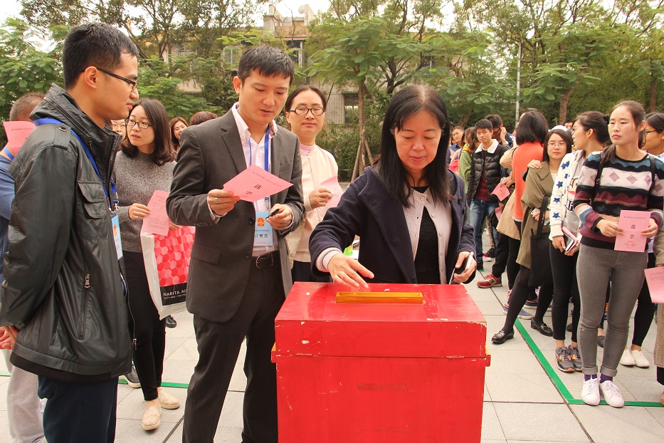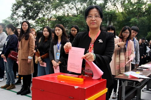 12月10日上午9时,思明区第十七届人大代表换届选举第93选区选举大会(外文学院分会场)在外文学院南光三前凤凰台举行,一千余名外文师生选民通过现场投票或委托投票的方式投下了庄严神圣的一票。外文学院党委陈志伟书记主持本次选举大会,副院长徐琪教授宣读介绍本次选举程序。