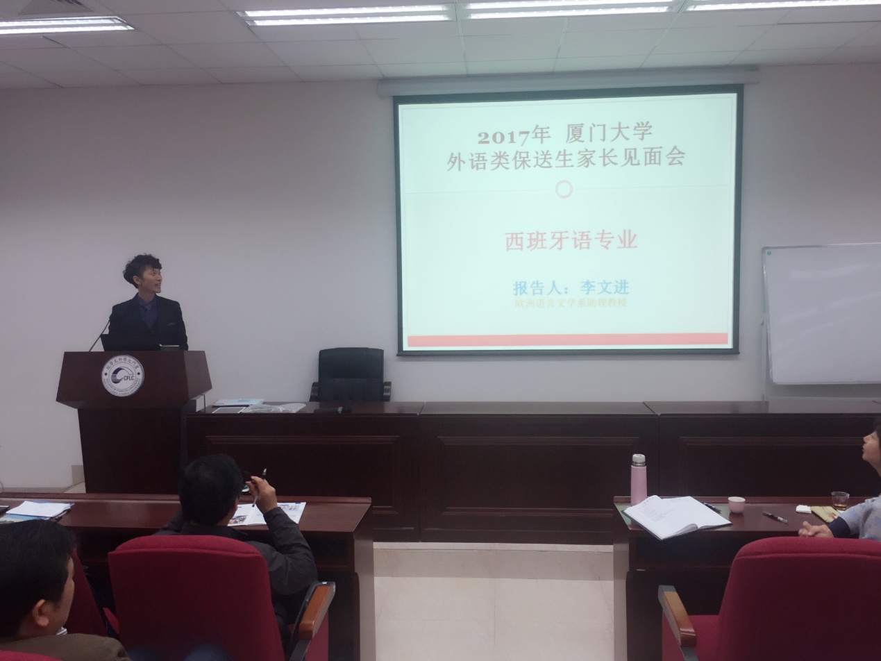 为让外语保送生家长进一步了解厦门大学的人才培养模式、学籍管理制度、综合性大学的教育资源,以及外文学院各专业的师资情况、课程设置特点等,我院于1月6日上午在南光三112报告厅召开了2017年外语类保送生家长见面会。分管本科教学工作的副院长徐琪教授、英语系主任杨士焯教授、日语系主任吴光辉教授、法语系主任胡佳教授、俄语专业顾鸿飞教授、德语专业方厚升副教授、西班牙语专业李文进博士及教学秘书参加了此次见面会。