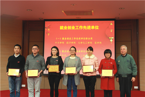 肖盈老师(右二)代表学院领取“就业创业工作先进单位”奖牌