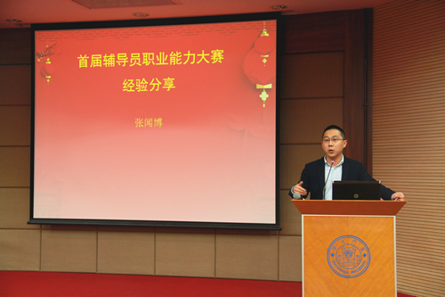 随后,学院辅导员张闻博作为厦门大学首届辅导员职业能力大赛一等奖获得者在会上作经验分享。张老师认为,辅导员职业能力大赛为大家提供了一个展现辅导员风采的良好平台,是促进辅导员之间进行朋辈交流学习、探索辅导员工作技巧的桥梁,辅导员只有做到“坚持职业、践行专业、恪守敬业”,才能真正成为学生“青春的导航仪”。