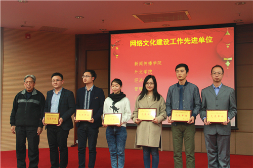 周晓牧老师(右三)代表学院领取“网络文化建设工作先进单位”奖牌