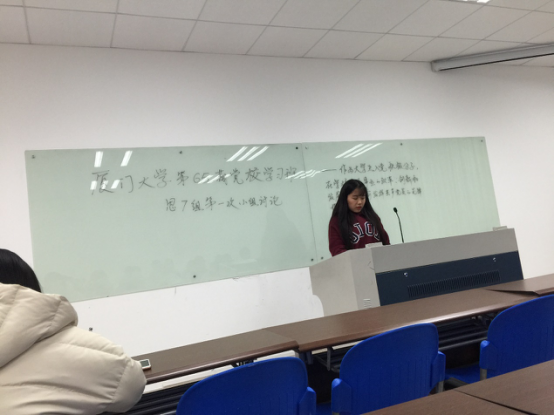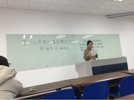 3月13日晚7点,厦门大学党委党校第65期(学生)党的基本知识学习班外文学院思7组学员第一次小组讨论在南光三415教室进行。此次讨论的主题是“作为大学生入党积极分子,在学校各项事业的改革、创新和发展中应如何发挥共产党员的先锋模范作用”。讨论由外文学院2015级本科生辅导员、带队老师周晓牧主持。思7组27名外文学院2015级本科生参与讨论,其中14名同学进行了重点发言。