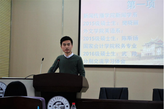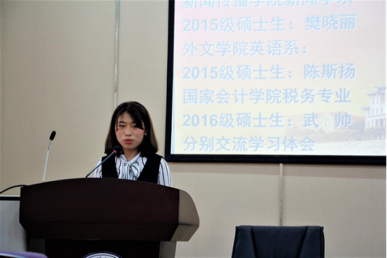 新闻传播学院新闻学系2015级硕士生樊晓丽、外文学院英语系2015级硕士生陈斯扬和国家会计学院税务专业2016级硕士生武帅分别代表三个学院的学员上台交流本次党校的学习体会。樊晓丽同学说道:“通过此次党校学习,坚定了我们的共产主义信念,更端正了我们的入党动机,党校学习使我们明白,党员身份绝不是套在头上的光环,它更应该是我们崇高的信仰!党校学习还加深了我们的党性修养,党的性质和指导思想为我们今后的学习和工作指明了方向。我们要时刻牢记党的性质和历史使命,全心全意为人民服务。”陈斯扬同学谈到:“党校培训虽已结束,但党员之路刚刚开始,入党,并保持党的先进性和纯洁性是我们一生的坚守,我们要先在思想上找自己的路,才能在实践中走自己的路,长久保持家国情怀和社会奉献精神,始终做到爱党、言党、为党。”武帅同学在交流时回忆了共产党员在抗击台风时的顽强精神,为这份红色的力量而感到自豪,他表示:“在当下‘两学一做’的热潮中,对于我们大学生而言,正是加强自身学习,为实现中国梦的好时机,所以我更加渴望,早日成为一名光荣的中国共产党党员,为共产主义奋斗终身。