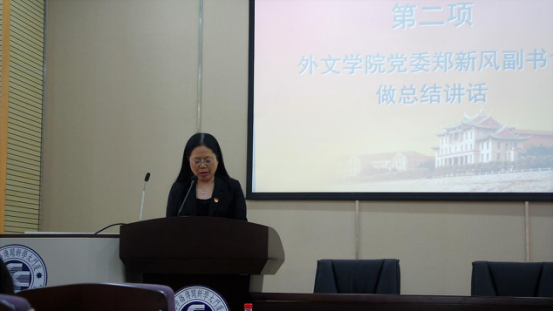 外文学院党委副书记郑新风老师高度评价了了本期党校中全体师生的努力,对全体学员提出三点期望——希望同学们继续坚守向善,向上的力量,抓好价值观的养成;希望同学们加强自身学习,努力做到在理论上清醒,在政治上坚定;希望同学们要严于律己,做好表率。郑新风老师由衷地希望同学们不忘初心,成为一个忠诚的马克思主义者。