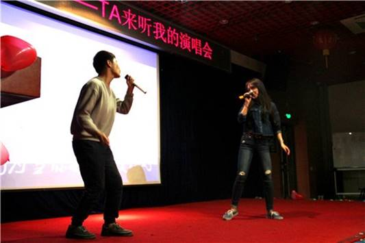 演唱会分为五个环节。开场节目是由2014级本科生王雅洁同学和侯仁杰同学带来的歌曲串烧《她来听我的演唱会+天天想你+你快回来》。男女对唱中,两位同学刚柔并济,高水准的表演吸引了在场所有观众的注意力。