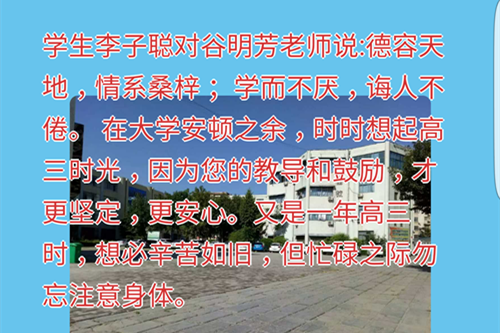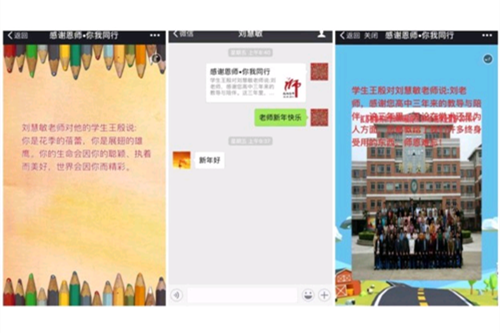 2月3日新年之际,王殷同学通过微信将电子贺卡发给了高中班主任刘慧敏老师,表达对老师三年教导的感恩之情。刘老师很快就给了回复,表达了新年的美好祝愿,言辞充满关怀与期待。