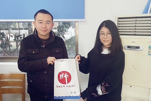 1月16日,实践队成员徐雁灵回到了她的母校看望老师,她回忆说:“看到我们回学校,老师们都很高兴,以前在课上不苟言笑的化学老师也绽放出了灿烂的微笑。”班主任李军豪老师拿着纪念品与她合影并关切地询问她的近况,昔日师生,言笑晏晏。