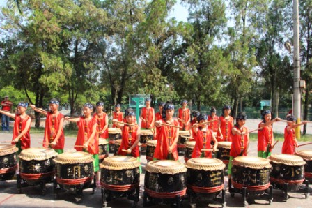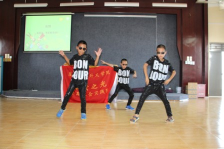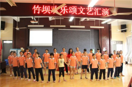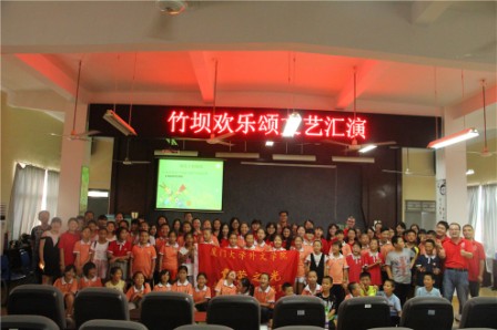 节令鼓表演 文艺汇演由支教组成员魏琛和竹坝学子李思思担任主持。在主持人简要介绍了此次实践活动各组所取得的成果之后,三名戴着墨镜、着统一服装的小男孩吸引了全场的注意,激扬高亢的歌声一出来,小朋友们劲爆十足的舞蹈就引来阵阵欢呼。