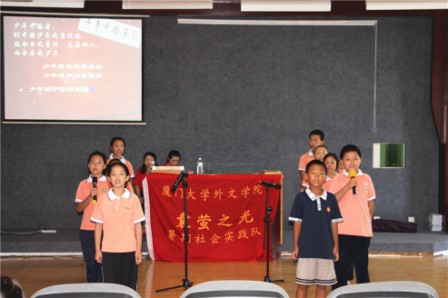 文艺汇演合影 此次文艺汇演是“囊萤之光”暑期社会实践队的成果展示之一,在过去7天里,实践队队员给孩子们带来了精彩的口语、书法、美术和音乐课,与孩子们一起度过了美妙的一周,也惟愿孩子们的朝气如厦大校园里火红的凤凰花一样,在夏日里以摧枯拉朽之势延遍整个青春。 |