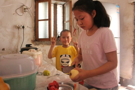 懂事的小姑娘准备水果 招待哥哥姐姐们