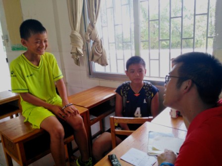 墙上温度计里的水银柱还在不断往上爬,不绝于耳的蝉鸣借热浪传来,仿佛永无休歇,厦门大学外文学院“囊萤之光”暑期社会实践队调研组成员们将录音笔、笔记本、问卷、驱蚊水等打包成饱满的行囊,走进了把大地炙烤得火热的阳光里。 7月25日,调研组一行就课余活动对学习、生活的影响等问题,对此次竹坝夏令营的营员代表和排球队代表进行了采访。调研组先来到了小学部,这次夏令营的孩子们都是竹坝鼓队的成员,他们的拿手好戏――二十四节气鼓,气势恢宏,动人心魄,广受各方赞誉。孩子们年龄各有大小,年级有高有低,当被问及参加鼓队的原因时,他们的回答出奇得统一――因为兴趣,因为热爱。其中一位高年级的孩子还补充道,鼓队的排练时间一般安排在周末,不会影响到学习,甚至还有不少成绩优异的同学参加鼓队,老师、家长也对此表示支持。且在鼓队里,孩子们还认识了新的朋友,收获了新的友谊,大大拓展了自己的社交圈子。不少队员表示,这样一项有意义的活动,毕业后仍也想继续坚持下去。 另一边的排球场上,烈日炎炎下,一个个排球在空中划出了道道蕴满力量与激情的抛物线。厦门市中学生排球比赛男排十连冠、女排七连冠的辉煌荣誉背后,究竟凝聚了多少艰辛和汗水,也许只有他们自己知道。在调研组对排球队的采访中我们了解到,因为热爱,他们在排球场上日复一日挥洒汗水;为了这薪火相传的荣誉,他们牺牲了几乎所有的课余时间全力训练。虽然高强度长时间的训练占用了不少学习时间,但他们仍表示会在重视并保持学习成绩的前提下,将这项热爱的运动进行到底。 尽管顶着夏日高温,稚嫩的执着还是只增不减,这些个小身板到底是生长在怎样一片沃土,身后又是什么样的父母在一路守护他们前行呢?为了深入了解孩子们的家庭环境,同时收集家长们对学校教育组织形式的反馈,午休过后,实践队队员们以分组家访的形式,走近了孩子们的家中。 第三组队员们首先去到的是一个叫可欣的女孩家中。爸爸初中毕业就在外打拼,直到现在还是以宽厚的臂膀扛起家里一女一儿的重担。见队员们来访,他一面张罗着西瓜苹果上桌,一面斟茶闲话。在闽南人拿手的沏茶续杯的娴熟手法间,调研组的成员和可欣爸爸,围绕小姑娘的学习成绩、家长的家教理念、给孩子的未来设想等话题展开了一系列采访。 随后,在可欣的带领下,队员们又先后走访好几个孩子家。不管去到红砖堆砌,上了年头的老式屋子,还是新建的西式小洋楼里,我们都从轻松亲切的闲聊式调研里,感受了家长们的苦心:无论在学习和健康向上的课外活动方面,都给予孩子们竭尽所能的支持和鼓励。 这大概就是孩子们在书海和球场上挥汗如雨,砥砺前行的最强后援之力了吧。  采访鼓队成员