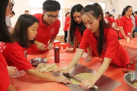 揉面 除蝴蝶酥外,实践队队员还有幸品尝了嫩滑清甜的九层糕、干脆爽口的烤饼、香脆可口的摇摇饼以及浓郁香醇的印尼芭蕉粽,其中芭蕉粽最合大家心意,清香的糯米包着肥而不腻的肉末,让人回味无穷的同时,也感受到南洋风味的独特之处。