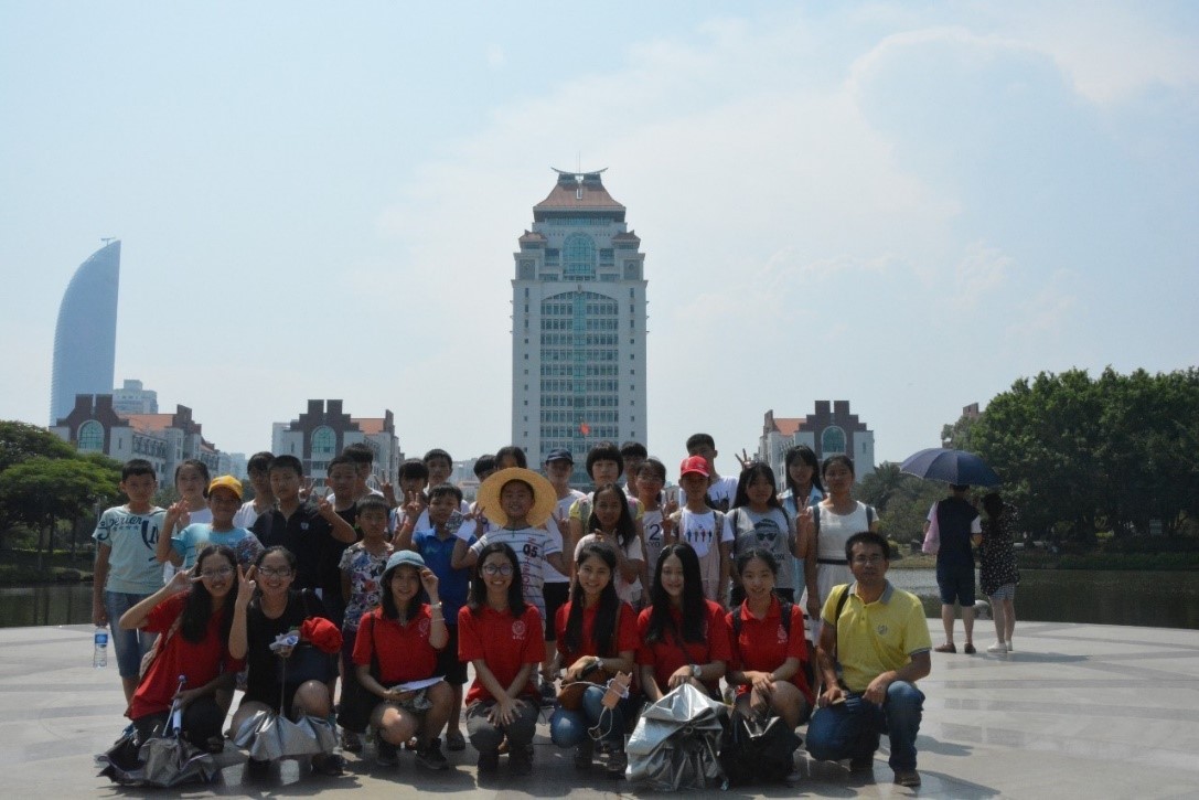 7月29日,厦门大学外文学院“英言厦语・快乐心象”实践队全体就要与安溪县湖上中学小朋友分别了。一周前,队员们满怀期待地来到这个宁静的乡村;今天,队员们带着满足与不舍离开。一周的日子,说起来并不是很长,但带给实践队所有成员的感动确是无法衡量的。 为了让小朋友们进一步感受大学的魅力,鼓励他们树立高远的目标,“英言厦语・快乐心象”实践队和湖上中学校长挑选了28名表现优异的小朋友,带领他们游览厦门大学并了解它。 经过三个多小时的舟车劳顿,实践队和湖上中学全体师生抵达了厦大。在芙蓉餐厅简单用餐休息后,实践队队员带领小朋友们开始有序地游览厦大。首先,何子琪同学在芙蓉湖畔为小朋友们介绍了芙蓉湖的名字由来、对面的颂恩楼,并参观了陈嘉庚先生与他的学生的铜像,告诫同学们要养成尊师重道的良好品德。在简单参观完图书馆后,实践队队员与小朋友们在讲解员的讲解下,参观革命史馆,了解厦大建校与发展历史,进一步了解厦大精神。最后,大家参观了美丽的上弦场与建南大礼堂。 在两个小时的简单游览后,实践队队员与小朋友们到达外文学院院楼南光三319教室对此次游园进行总结。首先,实践队队员为小朋友们播放了厦大介绍视频,让大家更好地了解厦大。随后,实践队教学组的同学们发表了对湖上中学学生一周表现的感想并表达了对他们的衷心祝福。小朋友们和校长也对本次社会实践发表了感想,孩子们简单朴实的话语流露出对老师的感谢之情、对未来的向往追求,这些真情是这次实践活动无比重要的价值意义。这次游历的带队老师钟德城老师也告诫学生,希望同学们铭记此次实践所带给他们的无比重要的意义,把握机会,感恩回报,有所梦想,为之奋斗。最后,王福来校长发言,希望同学们经历这次游园活动要有所感悟,并确定恰当的近中远程目标,考上心仪的高中。 在小朋友们回校之前,实践队队员与他们在外文学院院楼前的凤凰台合影留念,此次厦门大学外文学院“英言厦语・快乐心象”暑期社会实践活动也就到此结束。支教的意义不仅是将良好的教育带给小朋友们,更是将求学之心传递给他们,为他们带去希望、前进的方向!  实践队队员带领小朋友参观芙蓉湖