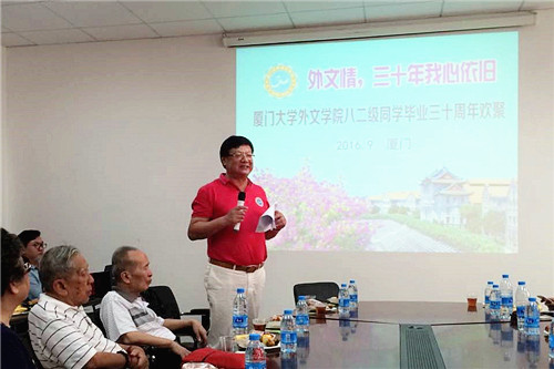 9月17日上午9点45分,南光三319会议室座无虚席。此时此地,厦门大学外文学院八二级院友毕业三十周年欢聚座谈会正式拉开帷幕。院长张龙海、院党委书记陈志伟、日语系副主任吴素兰等院系领导与12位当年的领导、老师出席了此次座谈会,近40位82级院友从世界各地欢聚于此。座谈会由82级院友、厦门大学孔子学院办公室主任、厦门大学汉语国际推广南方基地主任毛通文主持。 毛通文院友首先表达了对同学们的深切思念,他真挚的话语赢得了在座院友的阵阵掌声。随后,毛通文播放了他为老同学们精心准备的怀旧视频。一张张老照片伴着抒情的音乐在屏幕上闪过,院友们时而会心点头,时而感慨不已,时而开怀大笑,会议室里响起了阵阵感动的掌声。 随后,院党委书记陈志伟上台致欢迎辞。陈书记代表外文学院对各位院友的到来致以热烈的问候。她表达了对各位迎着风雨、不辞万里返校的院友的感动与感激之情,尤其对此次聚会的组织者们表示了衷心的谢意,并祝福大家在母校、母院度过愉快的一天。 张龙海院长向院友和老教师们介绍学院情况,他从学科建设、师资力量、学术科研等方面详细介绍了学院近年来的发展与成绩,同时也介绍了我院毕业生在社会各界各个领域所取得的卓越成就,并对学院的发展作出了美好展望。 随后,82级院友们依次发言。大家纷纷对自己三十年来的经历做了简单的回顾,特别强调了母院给自己打下的扎实基础为日后自己的事业和人生都带来了极大的帮助。他们当中,有的人留在厦门,有的人去了其他城市,还有的人侨居海外;他们或成为大学教授,或进入企事业单位,或走上创业之路……院友们的经历丰富多彩、不尽相同,但不变的却是他们作为老外文人的热情、真诚以及他们对母院深深的眷念与感恩。 座谈会最后,82级同学们盛情邀请当年学院老领导、老教师们发言。已达耄耋高龄的原外文系党总支书记陈瑞仁表示,看到诸位学子今日成才甚感欣慰,他希望同学们保重身体、诚信处事、孝敬父母、关心后辈。当年与同学们朝夕相处四年的辅导员,现任厦门大学孔子学院办公室党总支书记、厦门大学汉语国际推广南方基地党总支书记的苏子惺老师也饱含深情地怀念了难忘的时光,对同学们致以热情的祝福。其他老师们也纷纷表达了多年后再次见到自己当年的学生们的激动之情,并向大家致以诚挚的问候与祝福。82级同学们三十年后再沐师恩,纷纷报以感动的掌声。 座谈会结束后,师生们前往逸夫楼餐厅参加答谢师恩午宴。期间,师生进一步分享近况、交流感情,其乐融融。