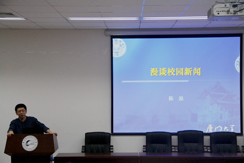 周晓牧老师主持本次讲座 陈老师针对“校园新闻写作”这一话题,围绕“什么是新闻”、“如何写好新闻”、“如何做好采访和素材积累”、“专题稿件的策划”、“新闻摄影的几点体会”、“记者的个人素质”六个方面进行了讲解。他首先为大家解释了校园新闻的含义。陈浪老师表示,校园新闻不仅要体现新闻快速、新鲜、典型的特点,更需要体现“真”、“善”、“美”的内涵,要有客观正确的价值导向,并且要能带给人震撼与思考。