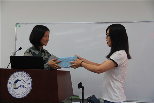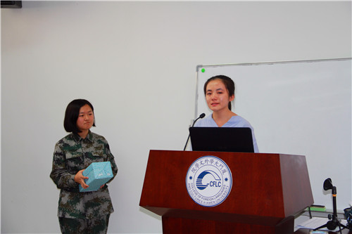 会上,牛姝吉同学也走上讲台与大家分享了她的入伍感言。她说,成为一名人民解放军是她从小到大的梦想,在几个月的准备和考核过程中,她也曾因父母的担忧而动摇过,但最终还是克服了困难,争取到了父母的全力支持,并最终通过了层层选拔。她腼腆地笑说,很高兴能有这个机会和同学们道别,也希望未来回到学校时还可以与同学们再度相见。随后,牛姝吉同学所在15级本科英专2班的班长代表全班同学表达了他们对姝吉同学的祝福并送上祝福卡片,祝愿她接下来在部队的学习与工作一帆风顺。