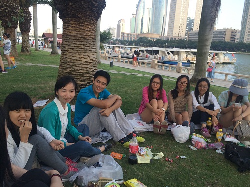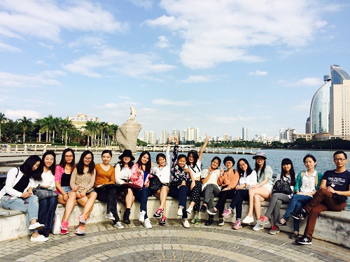为了增进班级成员间的交流,加强班集体凝聚力,11月22日下午,外文学院2014级研究生班同学在班团委组织下,前往厦门白鹭洲公园秋游。 为保证活动顺利开展,班团委们事先经历了开会讨论、走访宿舍、微信宣传,并前往目的地踩点等一系列过程。时值小雪节气,尽管全国大部分地区已进入寒冬,南方的厦门却依旧晴空万里,艳阳高照。中午1点,同学们在学生公寓公交站集合,乘坐公交出发,一路上兴致勃勃,欢歌笑语不断。 下车后,大家步行前往公园,沿途风景怡人,引得同学们争相拍照。欣赏完美丽的湖光秋色,并与白鹭女神合影留念之后,同学们来到草地,围成一圈席地而坐,开始活动。 班团委们及各位同学拿出准备好的零食,互相分享,与此同时,文娱委员徐远茜同学开始带领大家玩游戏。首先是“角色借用”,所有人随意聊天,每位同学须扮演坐在自己右侧同学的角色,在听到对方名字之后立刻做出反应,而对自己的名字则无回应,否则犯规,接受惩罚。看似简单的规则实则非常考验注意力与反应速度。游戏过程中,部分同学的快速反应让人拍手叫绝,违规者则必须接受惩罚,各种“恶搞”令大家捧腹大笑,游戏场面高潮迭起。接下来是“传手绢”和“歌曲接龙”,游戏虽然传统,但是同学们也玩得乐此不疲,期间状态百出,欢笑连连。 游戏结束,大家开始了谈心,互相交流近况,分享彼此在学业、工作和生活中的收获以及遇到的问题,探讨解决方法。对于新一届班团委的工作,同学们纷纷做出了肯定,并对班级管理提出意见与建议。之后是创意合影,大家以湖水和草地为背景,将一个个青春洋溢或憨态十足的瞬间永远记录下来。 此次班级秋游活动使同学们在紧张忙碌的学习生活之余得到了放松,也加深了彼此之间的了解。班团委们表示今后还将开展更多丰富多彩的班级活动,为大家的研究生生活书写更多更美好的回忆。  创意合影