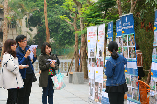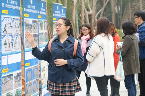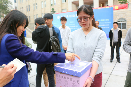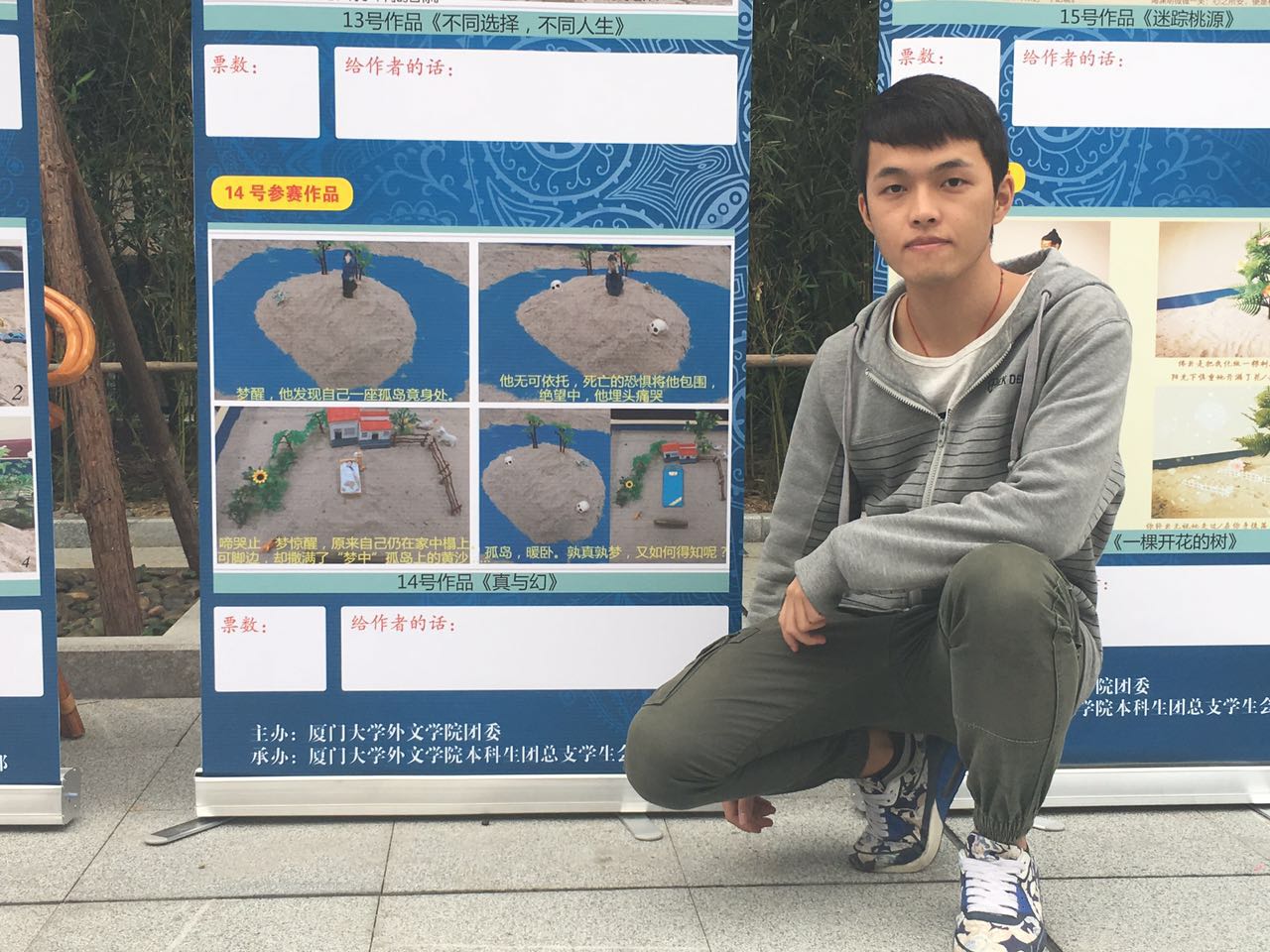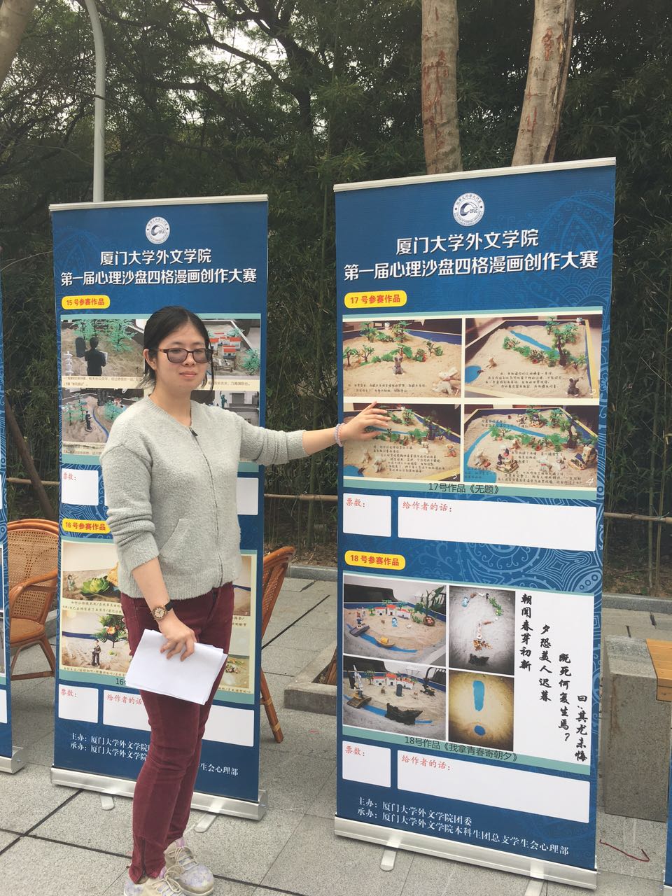 | 12月21日12时30分,由厦门大学外文学院本科生团总支心理部举办的心理沙盘四格漫画创作大赛在外文学院南光三广场凤凰台进行了现场作品展示和评选。本次比赛邀请了厦门大学学生处副处长刘艳杰老师,心理咨询与教育中心的赖丹凤、陈梅香、祝婧媛、黄福生、姚莹颖等几位专业老师担任嘉宾评委;外文学院院长张龙海,院党委副书记郑新风、杨云良,院团委书记、研究生辅导员乐无恙,院团委副书记、2012级本科生辅导员肖盈,院团委副书记、2014级本科生辅导员戴晓燕,2013级本科生辅导员张闻博, 2015级本科生辅导员周晓牧、杨盛澜也莅临评选现场。 本次创作大赛自11月15日至12月15日持续一个月,同学们积极响应号召,创作了二十份优秀作品,切实贯彻了“徜徉四格空间,构筑我的世界”的大赛主旨。比赛结果由两部分组成,即评委根据参赛作品及选手现场解读打分,以及在场师生不记名投票。 在同学们的作品中,不仅有对现实事件的解读认知、对寓言故事的重新探索,还有对爱情观、人生观的深度思考。漫画的种类多样、构思巧妙、主题鲜明,体现了当代大学生的心理状态和艺术修养。同学们的现场解读更为风格各异,有的风趣幽默,有的引人深思,通过参赛选手的现场解说,更进一步地展示了沙盘漫画的深刻立意,使比赛评委及在场师生更好地了解了参赛作品。 本次心理沙盘四格漫画创作大赛将沙盘与漫画的形式相结合,以新颖的比赛方式,为同学们提供了一个表现心理意识、展现艺术修养的平台,丰富了同学们的课余文化生活,对于鼓励同学们传达心灵感悟、抒发内心情感具有积极的引导作用。  参赛作品展示  在场评委及嘉宾  参赛选手讲解作品  评委老师听参赛选手讲解作品  学生现场投票  参赛选手介绍作品  参赛选手介绍作品  参赛选手介绍作品  四格漫画展  四格漫画展 | |