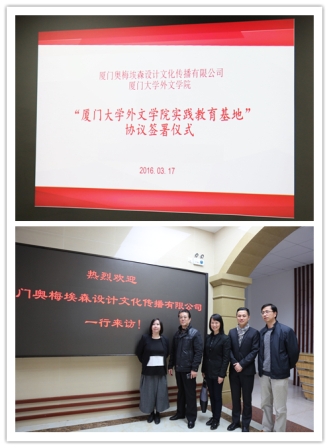 2016年3月17日下午,我院与厦门奥梅埃森设计文化传播有限公司签署“厦门大学外文学院实践教育基地”协议仪式在南光三524会议室举行。厦门奥梅埃森设计文化传播有限公司施洁予总经理、姚远副总经理、陈昊洋副总经理等一行与我院徐琪副院长、法语系主任胡老师、欧语系副主任方老师等师生代表共同出席。