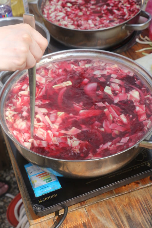 俄方小伙伴这边也不甘落后,红菜汤已经咕咕冒泡,冷杂拌汤倒入格瓦斯也准备好了,重头戏就是俄罗斯大肉串了。烤肉用的牛肉加入洋葱及调味料腌制了好久,穿了串儿便上了烤架。烤肉的焦香味不一会儿就溢了出来,流着油,鲜嫩多汁。中方小伙伴们也把腌制好的鸡肉和鸡翅拿出来夹在烤架上不停地翻烤......