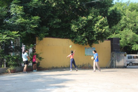 前行途中,传来的球声引起了我们的注意,寻声望去,只见几个十岁左右的小女孩正在练球,向吴老师问询后方知他们都是自发前来练球。在当今这个浮躁的时代,受父母们望子成龙心愿的影响,城里孩子们埋头于兴趣班和补习班无法拥有自己梦想的童年,更别提可以根据自己意愿坚持做一件事情。而眼前这几个十岁左右的孩子,每天清晨早起练习排球,没有人催促,没有人强求,但她们依然不怕辛苦地练球。殊不知世间最难的事情,不是尝试一件事,而是十年如一日地坚持一件事,正如我们“囊萤之光”暑期社会实践队来竹坝学校实践了十个年头。这几个孩子让我们在清晨就感受到了不一样的温暖。