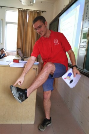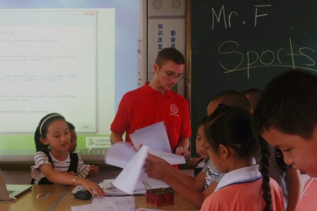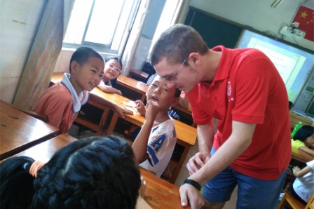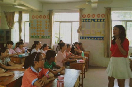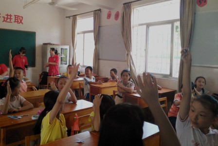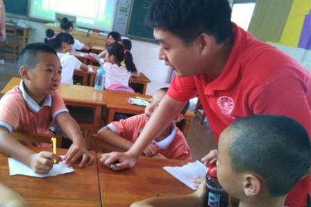 炎炎烈日下,暑气正暄的厦门同安竹坝,有这么一群可爱的支教队大朋友,他们执教鞭,登教坛,为圆满完成这人生中珍贵的教学初体验,奉上了如身上鲜红色队服一般似火的热情。 7月22日,厦门大学外文学院“囊萤之光”暑期社会实践队,在再次到访同安竹坝学校的第二天,正式拉开了支教活动的序幕。今年已经是“囊萤之光”实践队与竹坝学校合作暑期实践项目的第十个年头,在这意义非凡的一年,实践队和竹坝学校都呈现出自己崭新的风貌。 首先,此次参加暑期教学活动的竹坝学生分布首次横跨四年级到初三这六个年级。为适应不同年级学生的需要,教学上也分成高、低年级两个班分别授课,支教队也按这一年级划分展开内容丰富的授课。其次,支教队伍首次迎来了外国留学生的加入。课前,孩子们已经用最天真的笑容迎接这位可爱的金发大哥哥乔治(George)的到来,眼神中闪烁着雀跃的光芒却也难掩腼腆。而在乔治生动有趣的纯正美式口语课后,他们一改先前的羞涩,围绕在乔治身旁叽喳不停,开启十万个为什么问答模式――不经意间,一条远跨重洋的国际友谊桥梁已在这异国师生之间悄然架起。