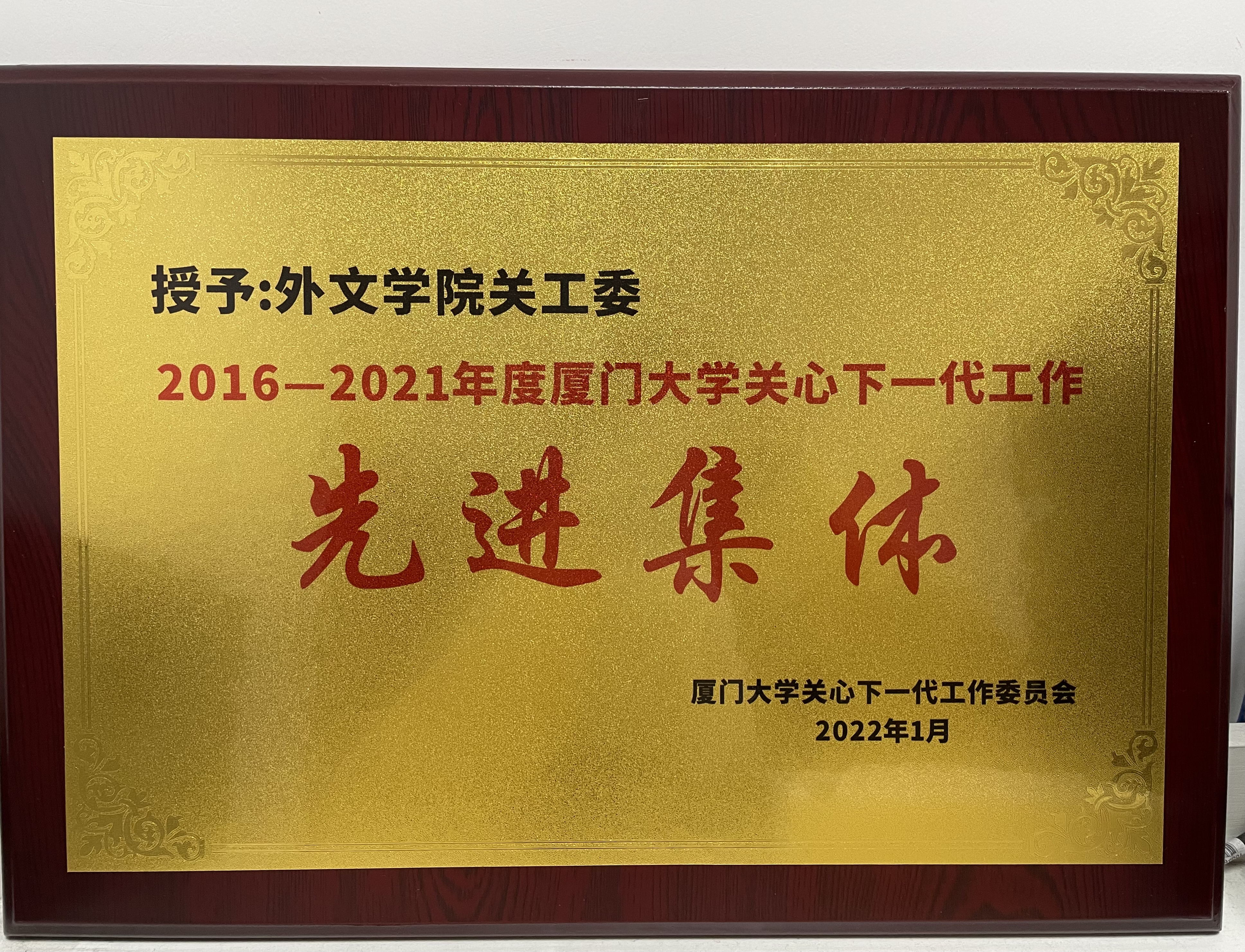 今年是厦门大学关工委成立30周年。为大力弘扬“五老”精神,引导激励更多“五老”投身关心下一代工作,推动厦门大学关心下一代工作创新发展,近日,学校对在校院各级关工委工作中表现突出的集体和个人进行了表彰。其中,外文学院关心下一代工作委员会荣获厦门大学关心下一代工作“先进集体”,我院吴珊珊老师荣获厦门大学关心下一代工作“先进工作者”。