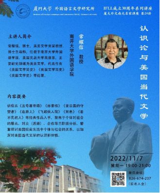 11月7日晚,南开大学英美文学资深教授、博士生导师常耀信教授在厦门大学外国语言文学研究所30周年所庆之际应邀为厦门大学师生带来了题为“认识论与美国当代文学”的精彩线上讲座。讲座由厦门大学外文学院副院长、厦门大学外国语言文学研究所所长辛志英教授,及厦门大学外国语言文学研究所副所长林斌教授共同主持。常耀信教授从《五号屠宰场》《赫索格》《麦田里的守望者》《在路上》《飞越疯人院》《紫色》《看不见的人》等经典作品入手,聚焦于个体对社会的服从、逃避、合作等三个不同阶段,着重探讨美国现实生活中个体与社会的关系,以加深对美国当代文学的认识和体悟。