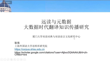 11月14日晚,上海外国语大学语料库研究院专职研究员、Baker翻译与跨文化研究中心副主任、译介学与中国翻译话语研究中心主任耿强教授为外文学院师生举办了题为“远读与元数据:大数据时代翻译和识体播研究”的线上讲座,讲座由双语词典与双语语言文化研究中心杜开怀副教授主持。
