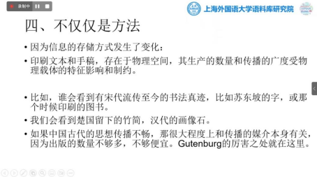 耿强教授从大数据时代背景下知识的生产和传播谈起,并由此引出翻译研究的学科知识传播这一话题。当今社会正处在一个印刷和数字混杂的时代,知识生产方式和传播方式已经发生很大改变。元数据是大数据时代翻译知识生产的副文本,可以使用技术手段将其转化为信息和知识。耿教授指出在知识量快速增加的当下,传统的翻译书评这种优选个别文本进行细读的质性研究方法值得怀疑。但与此同时,翻译知识生产所产生的大量元数据无人问津。