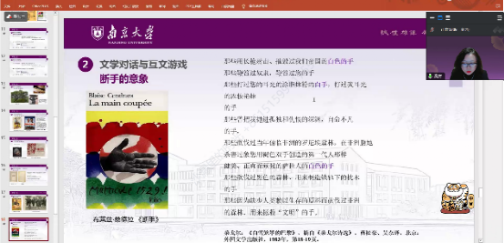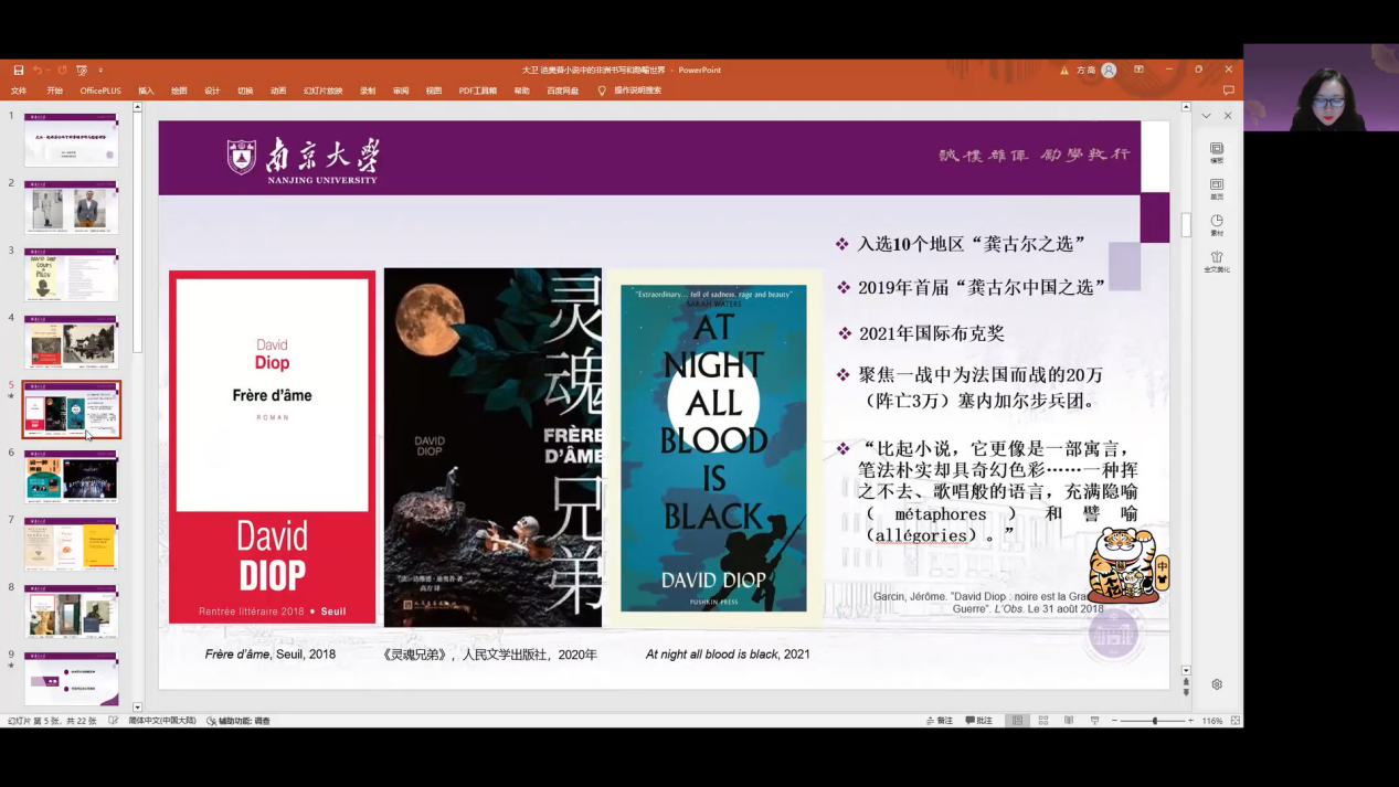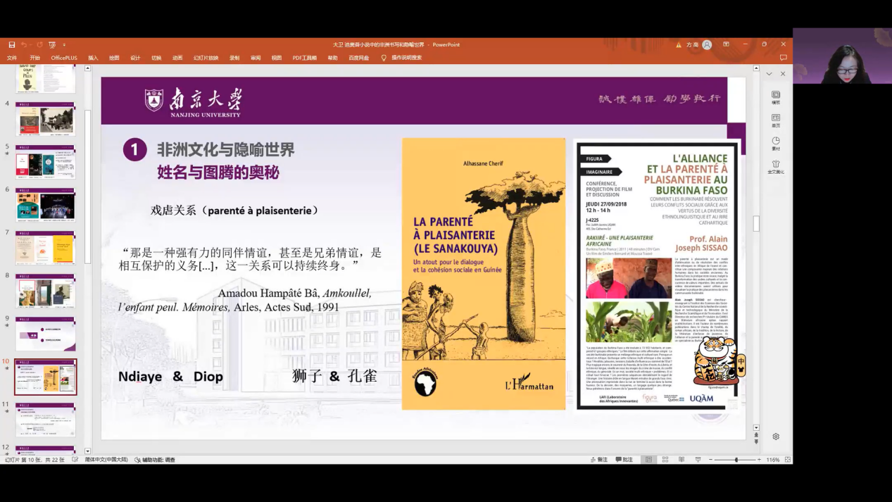 10月19日晚,南京大学外国语学院党委书记、法语系高方教授,应外文学院法语系邀请,开展了一场题为“大卫·迪奥普作品中的非洲书写与隐喻世界”的讲座。本次讲座通过腾讯会议在线播放,不仅本校师生积极参与,还吸引了包括来自清华大学、华东师范大学、南京大学的众多师生在线聆听。外文学院副院长刘悦教授主持讲座。