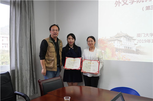 11月25日下午,厦门大学外文学院第三期青年学者沙龙活动于德贞楼524会议室顺利举行。活动由郭颖副教授主持,学院两位青年教师梁青、胡晓静应邀担任本次活动主讲人,知名学者杨仁敬教授担任点评嘉宾。副院长吴光辉教授出席活动并为两位青年教师颁发证书。