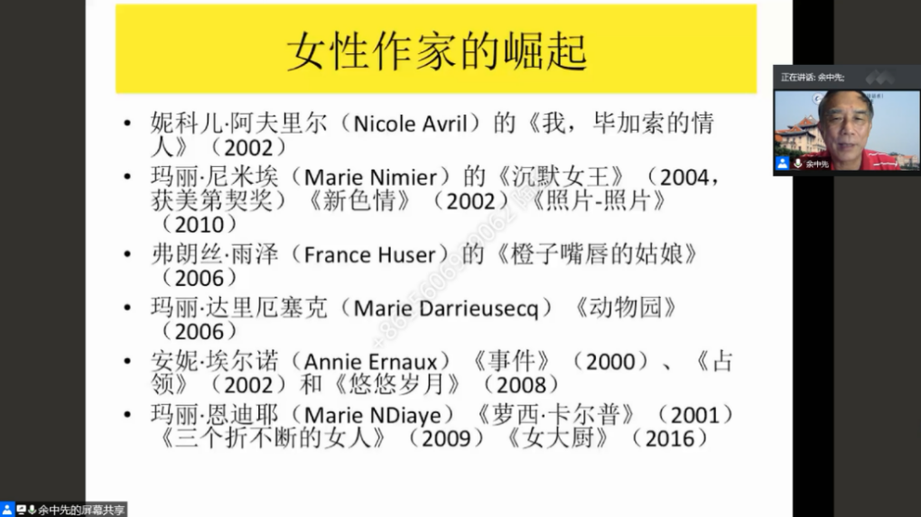 接着,余教授又指出,新世纪的法语文学,女性作家占据了新世纪法语文学的半壁江山。女性作家以其颇具女性意识和女性特色的写作,成为文坛的中坚力量。女作家的兴起一方面多多少少是女权主义长期斗争的结果,另一方面和现代的职业选择也有关系。女作家的特点主要有:对生活的全面观察;细腻的内心世界;工作态度的认真。她们的在某种程度上说,女作家的写作在手法的独特性、视角的奇异性、文字的细腻性、感情的真切性方面往往超过相当多的男作家。回顾20世纪以西蒙娜·波伏瓦为代表的女权主义作家,她们的奋斗对于现代女作家的崛起来说功不可没。余教授列出了一些具有代表性的女作家及其作品,如:妮科儿·阿夫里尔的《我,毕加索的情人》、玛丽·尼米埃的《沉默女王》、弗朗丝·雨泽的《橙子嘴唇的姑娘》、玛丽·达里厄塞克的《动物园》、安妮·埃尔诺的《悠悠岁月》、玛丽·恩迪耶的《三个折不断的女人》等等,并对其中一些作品的内容和主题做了简要提示。