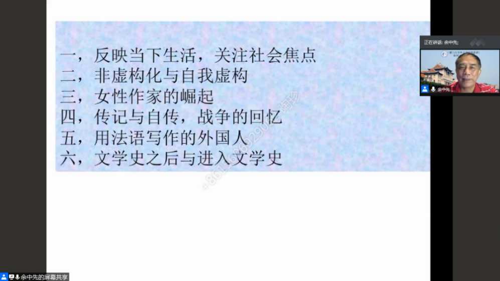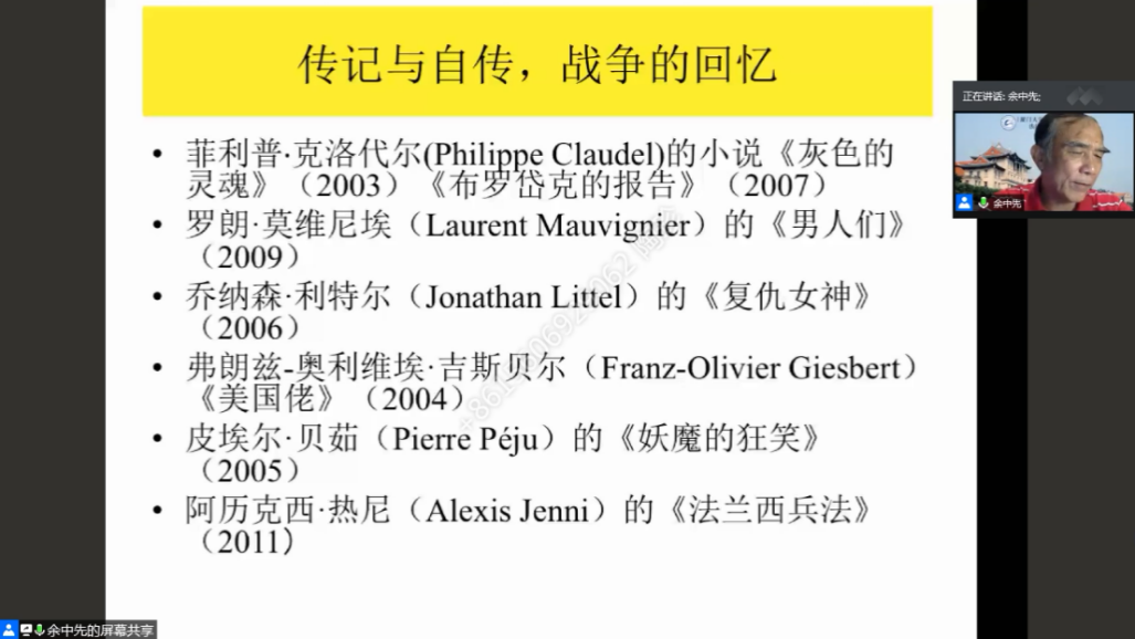 余中先教授的演讲结束后,讲座主持人鲁京明教授对本场讲座的内容做了精辟的总结,讲座与谈人、厦门大学外文学院讲座教授刘成富教授也进行了精彩的点评,并就在新世纪法语文学与战争的关系、文学中关于生与死的思考、法语文学的构建等方面发表了自己的见解,并同余中先教授做了进一步的交流和对话,令云端的广大听众深受启发。