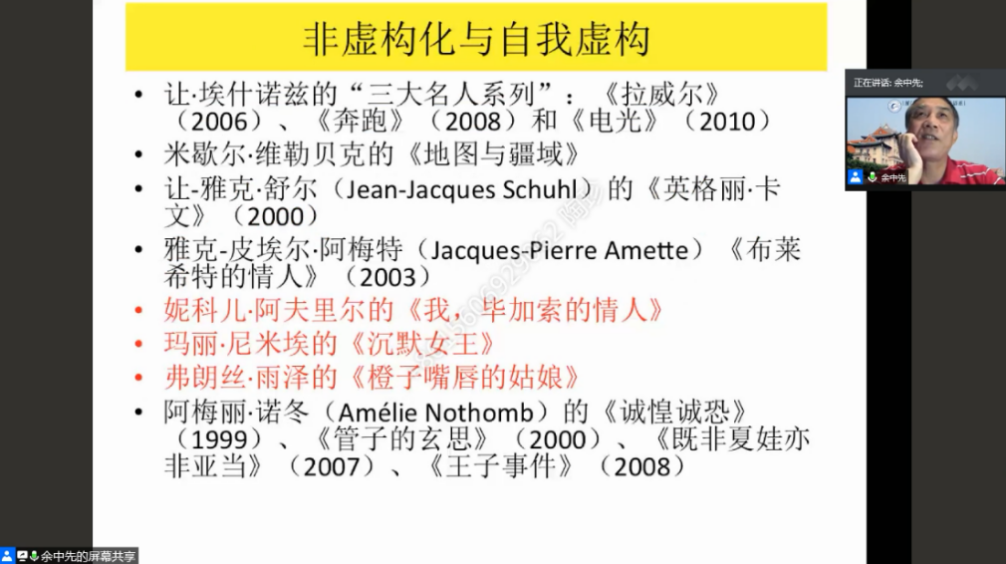 余教授认为,80年代后法国文学一个显著的倾向就是非虚构化或纪实化。也就是说,在很多作品里,更多地采用史实和现实的资料,采取真实的人物、真切的情节,这种倾向在法国一度成为潮流。进入新世纪以后,这种倾向并没有太大的改变,但“小说把想象力用来为真实可靠性服务”似乎又变成了“小说把真实可靠的材料用来为想象力服务”,尤其是小说中的“自我虚构”(autofiction,也译为“自我撰写”)。非虚构化倾向与自我虚构形成一股风气,成为当代小说的一大特点。例如:让·埃什诺兹的“三大名人系列”《拉威尔》、《奔跑》和《电光》均采用了人物传记的素材,米歇尔·维勒贝克的《地图与疆域》对个人故事进行了虚构,让-雅克·舒尔的《英格丽·卡文》以历史上的人物为基础进行创作。余教授介绍道,将非虚构化倾向与自我虚构发展到极点的,是洛朗·比内的《语言的第七功能》这部作品,它将法国社会著名的文学批评家、思想家几乎都囊括其中,堪称现代版的《儒林外史》。
