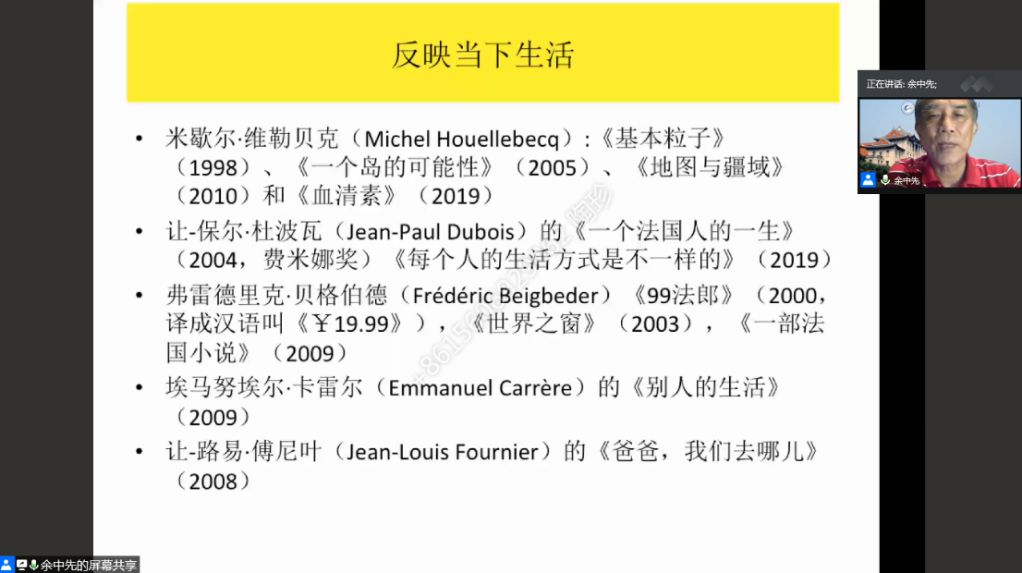 余教授指出,反映当下生活仍是文学写作的主流,但种种的创新手法寓于传统和经典模式中。现代派之后的某种所谓的“回归”现实,“回归”经典,已经带上了现代派的痕迹。如果从文学与社会的关系来看,新世纪二十年的文学作品必定反映出现代社会的一些特点。法国当下社会的特点有:欧洲一体化,欧元,无边界;互联网,数字化;移民问题,恐怖袭击等。当下文学也随之出现了一些新的特点:作家生存比较困难,寻求赞助;网络写作日趋盛行等。余教授认为,当下法国文学总的趋势是处于某种“克制”当中:语言规范化、,重返情感同化、,虚构记忆、,驱逐死亡。余教授继而举出了一些关注现实问题的代表性作家,如:被法国文坛称为“坏小子”的米歇尔·维勒贝克和弗雷德里克·贝格伯德,前者代表作有《基本粒子》、《一个岛的可能性》、《地图与疆域》等,矛头直指法国社会,批判锋芒锐利;后者代表作有《99法郎》、《世界之窗》、《一部法国小说》等,亦对现实充满讽刺和自嘲。还有让·保尔·杜波瓦的《一个法国人的一生》,将个人的生活经历与法国社会的历史大背景紧紧结合在一起,对现代社会进行重构。其他的作品如:进行自我反省——奥利维埃·罗兰的《纸老虎》、,传统作家——端木松及艾克托尔·比安科、试图重构,社会新闻(重构)——的雷吉斯·若弗雷《疯人院》和贝松《十月的孩子》,均都涉及到历史与现实的种种问题。